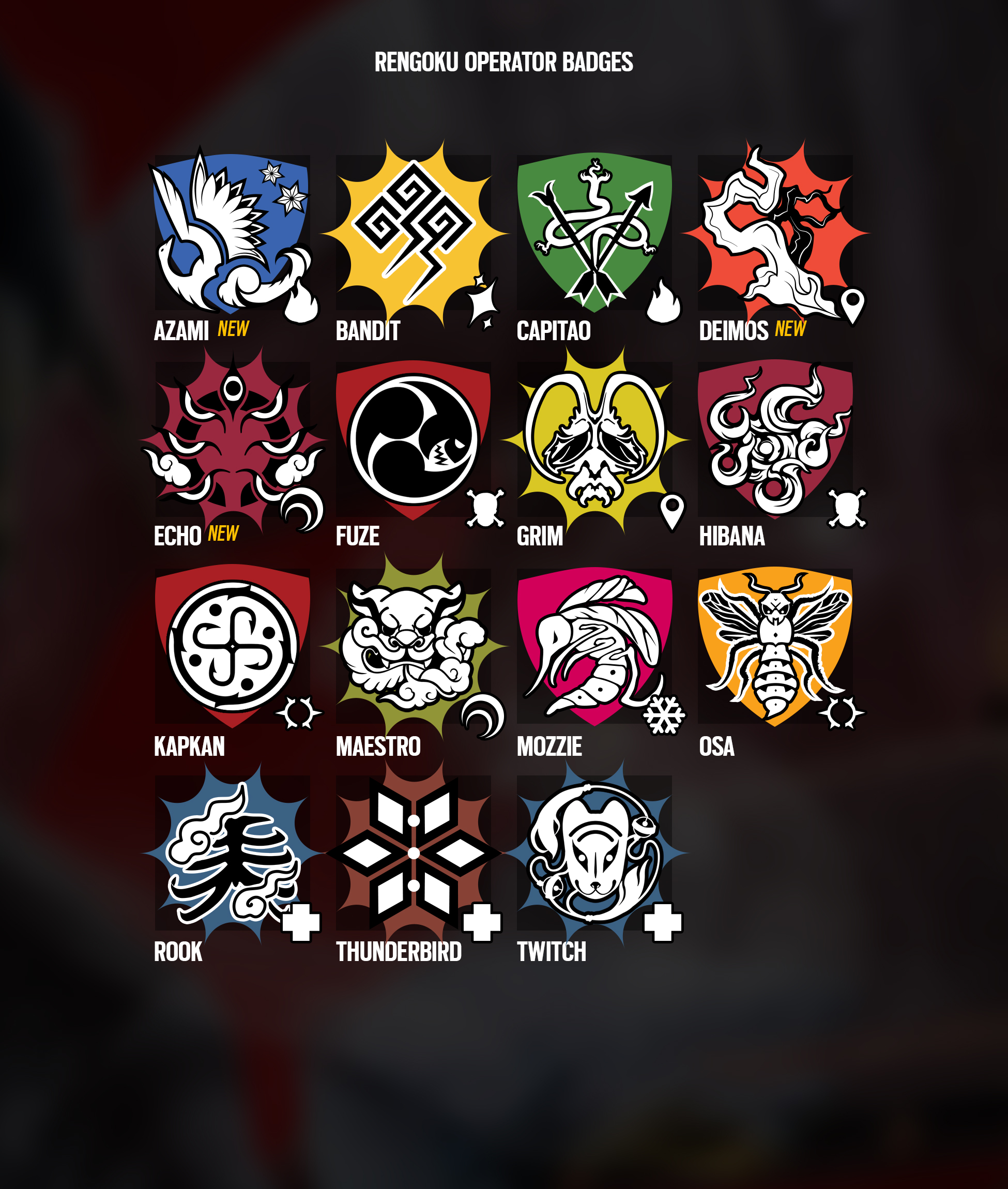 Badges, or Crests like we called them then, were designed with families and inspirations from their skin concepts in mind for operators. As emblems that would shape who they are and what lineage they would represent; sometimes refering to beasts, symbology, myths and legends.