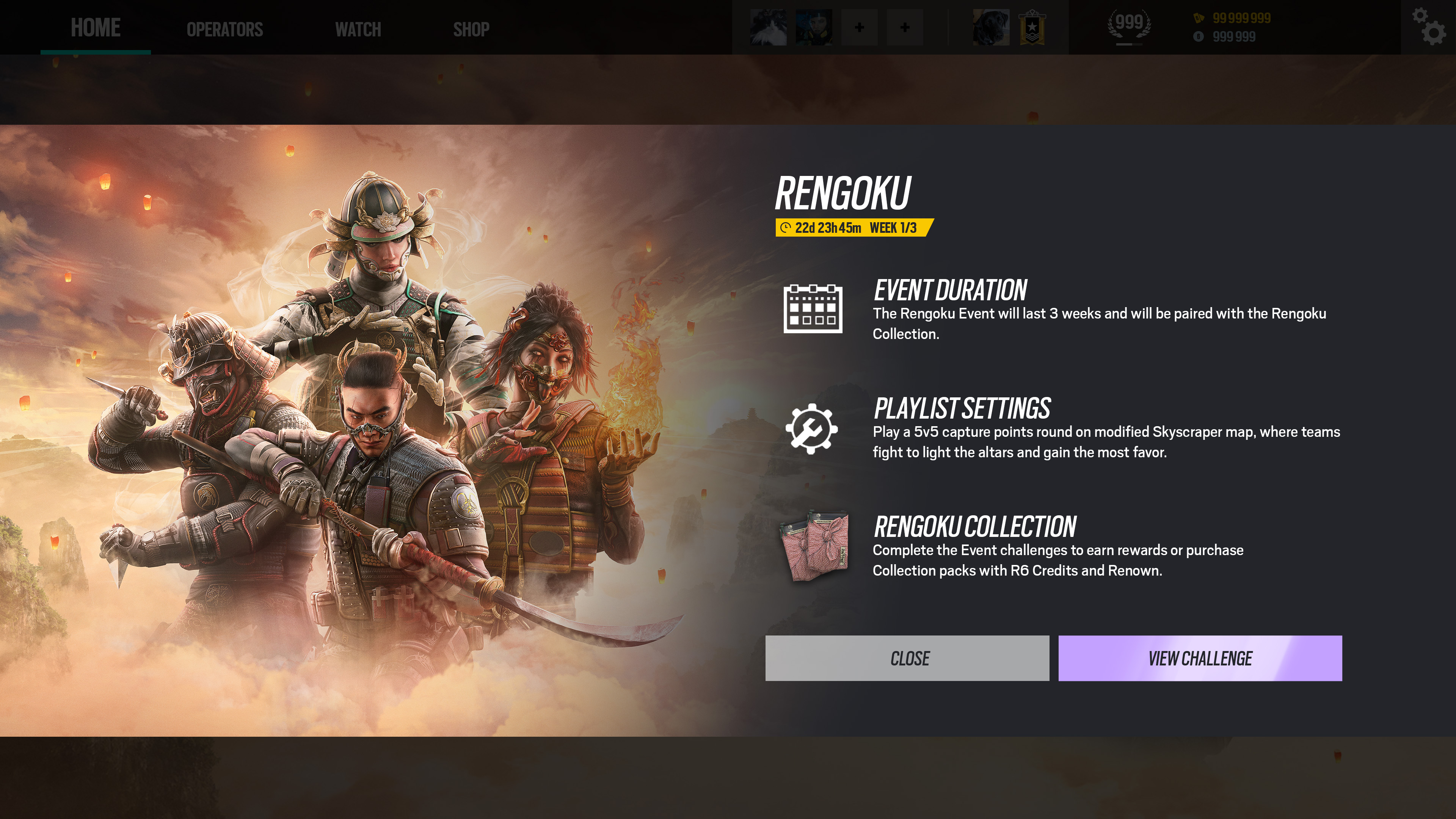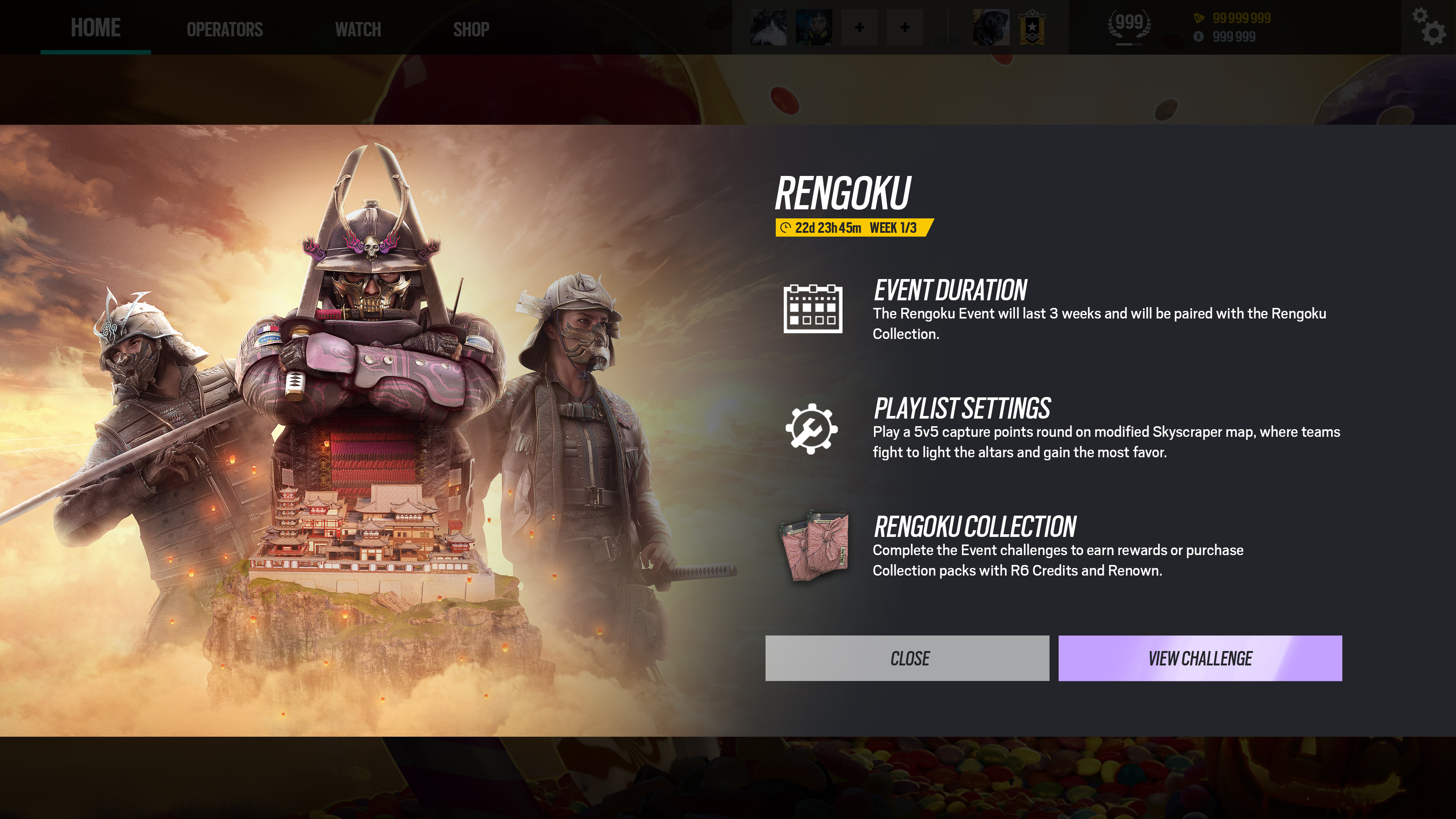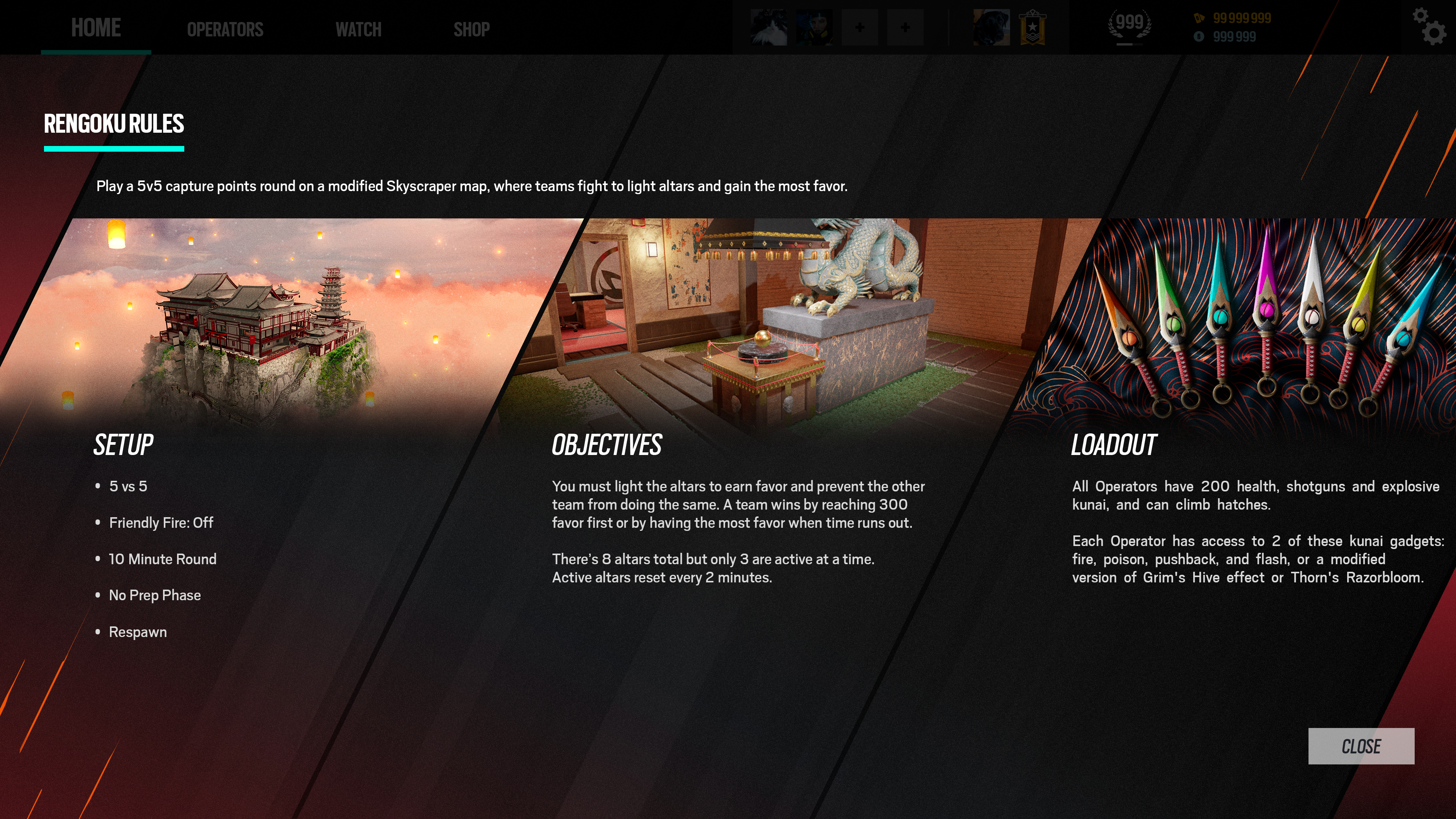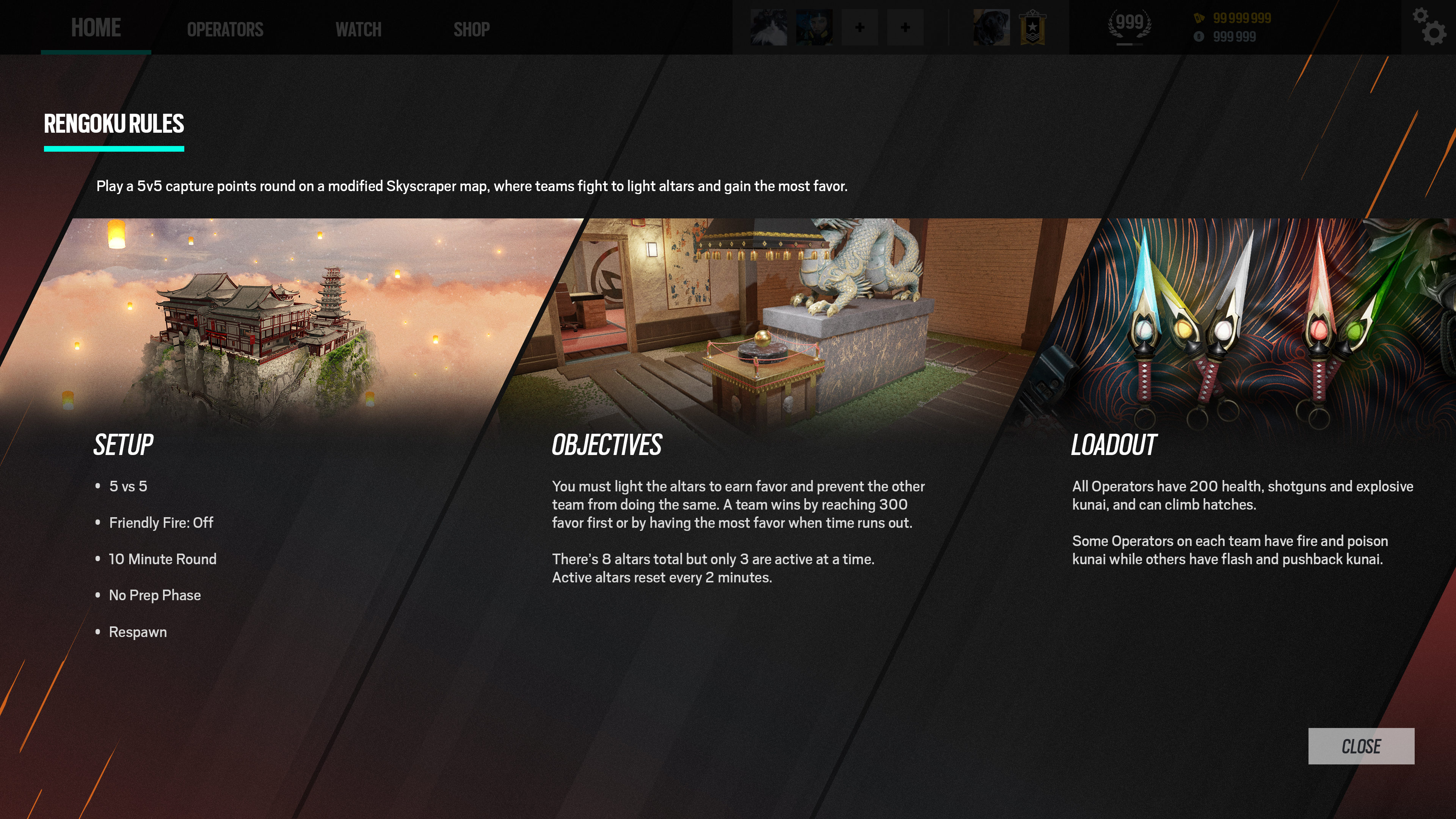 Rainbow Six: Siege Rengoku event, with now more than 3 iterations running since 2022, is a gamemode of frantic Control Point team deathmatch. Both teams try to control limited time activated Altars to make points in a long single round match.