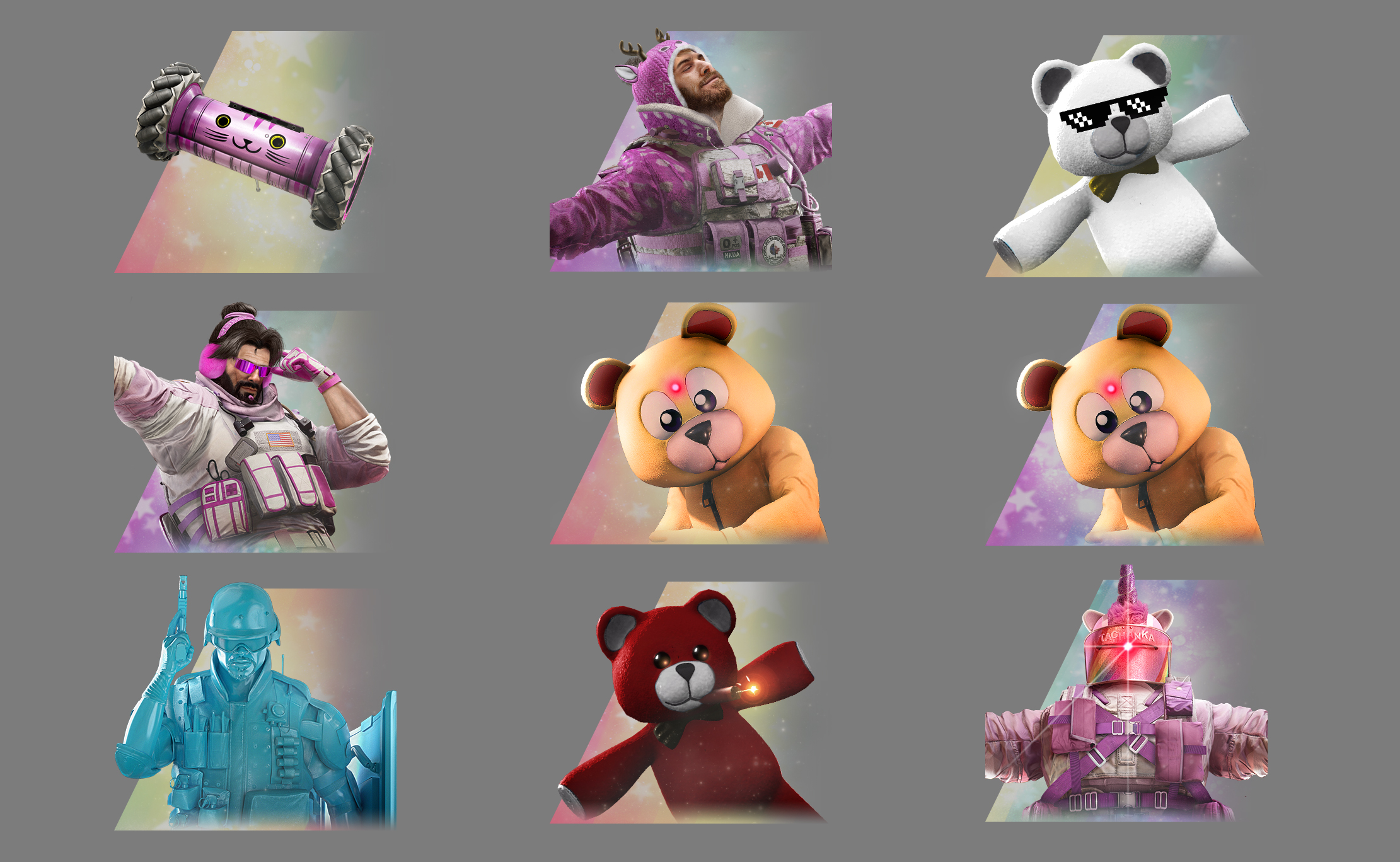 The Operator Badges in this event we designed with "cutsy stickers" in mind. Made alongside the texturing team, we adapted animals, and inspiration behind the skins and toys to give them all a unique twist.