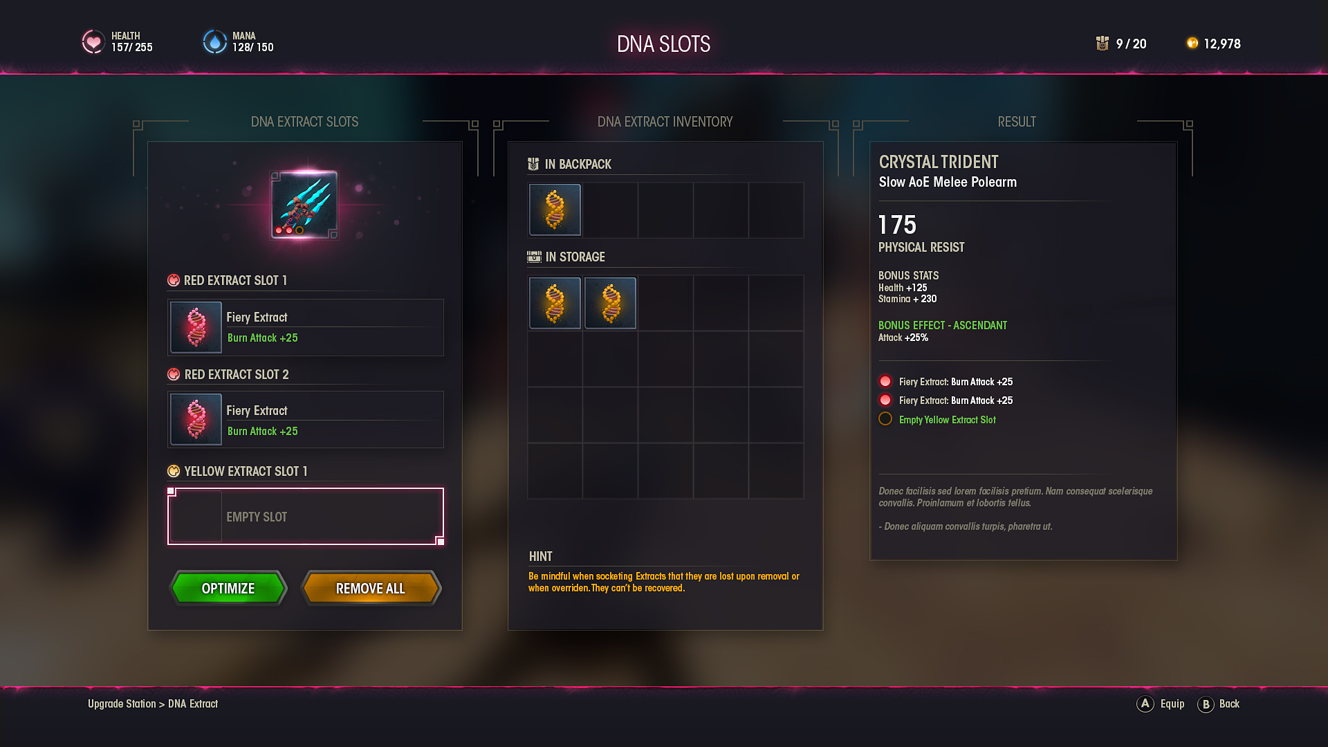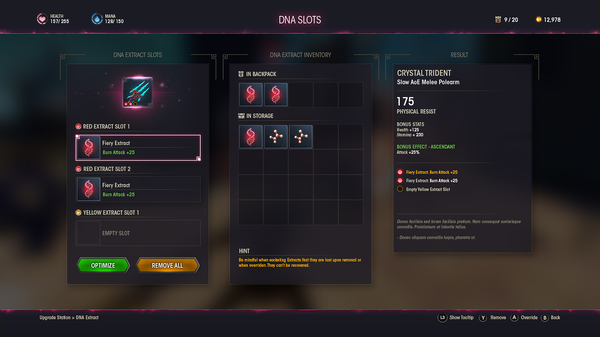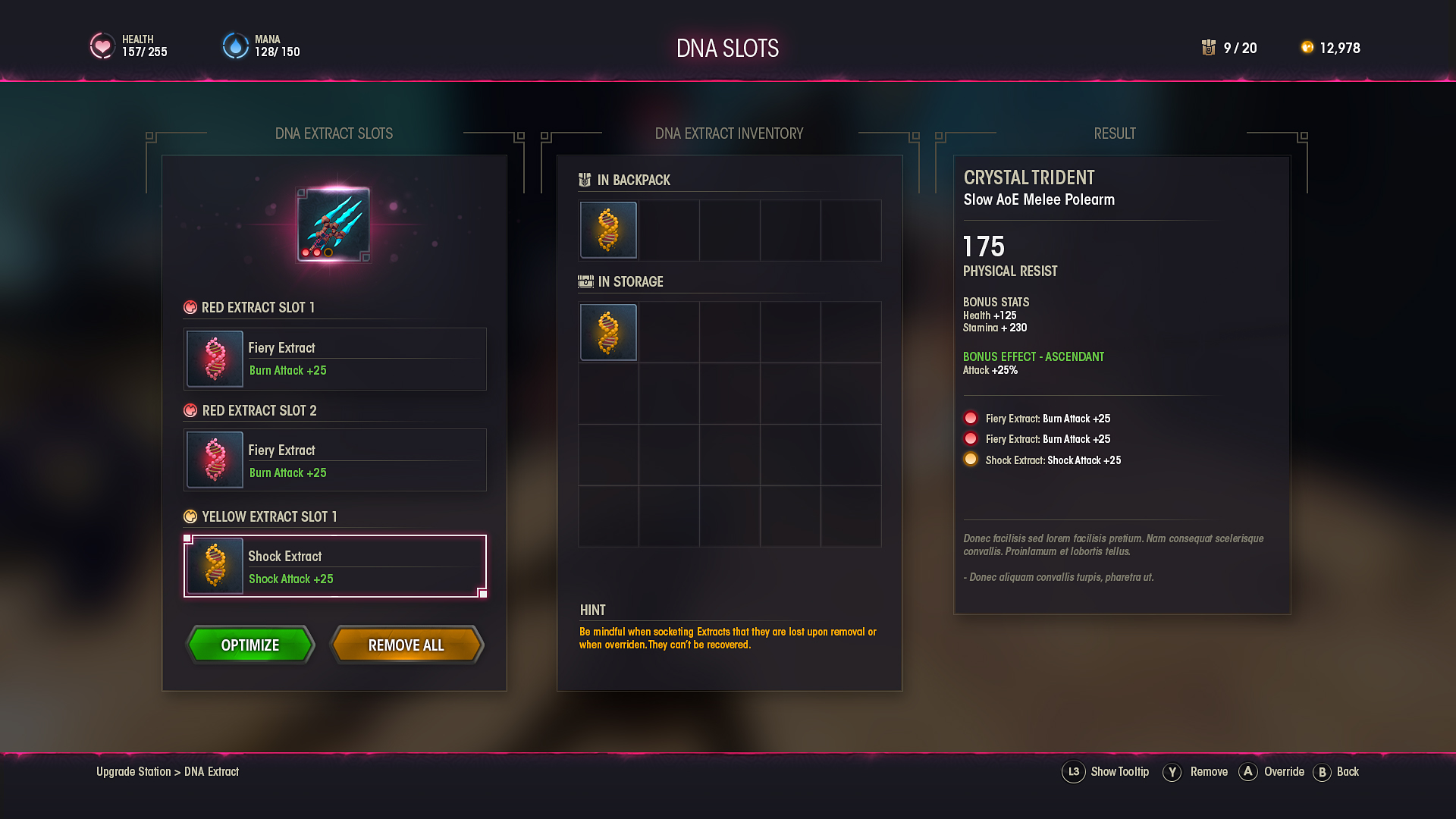 The last part of the main menus was the Data Extract menu. This was basically a socketing menu for min/maxing stats of your upgraded items. Each socket having their specific bonuses.