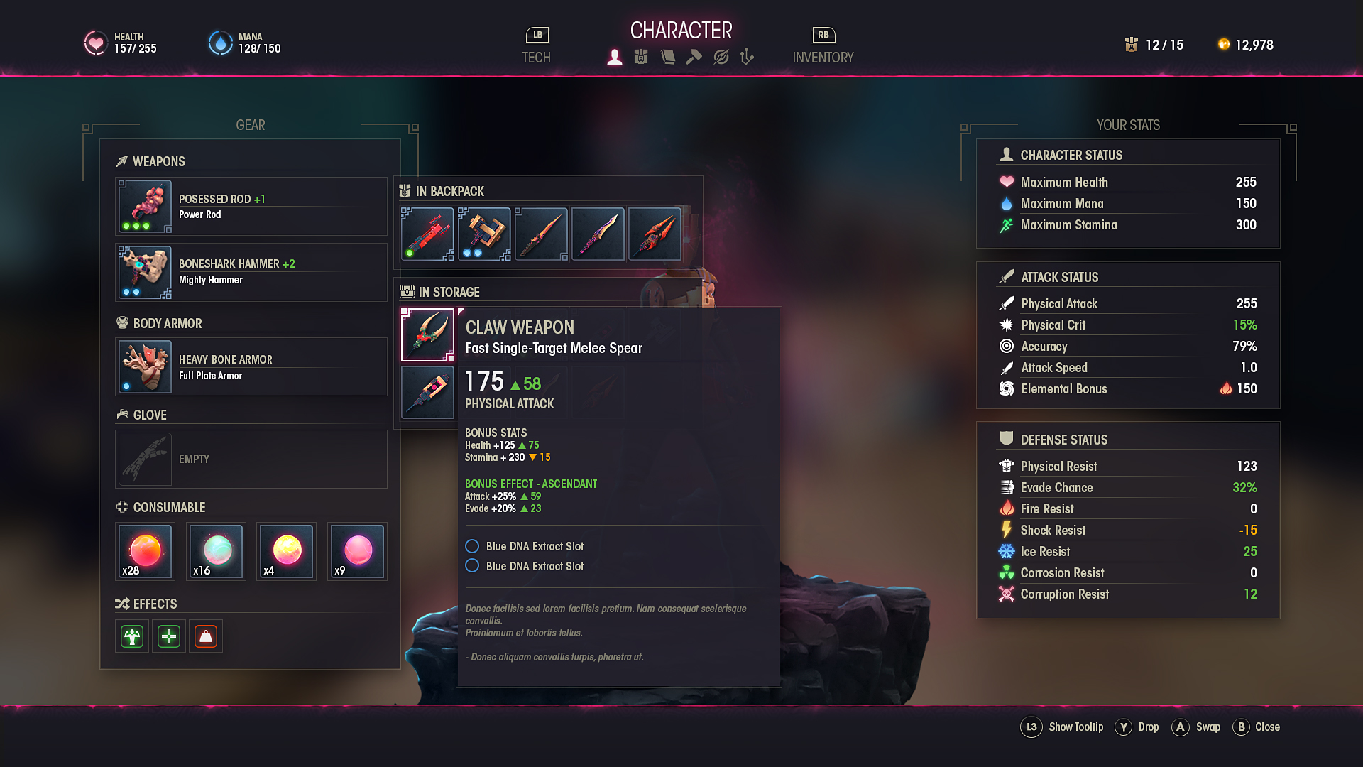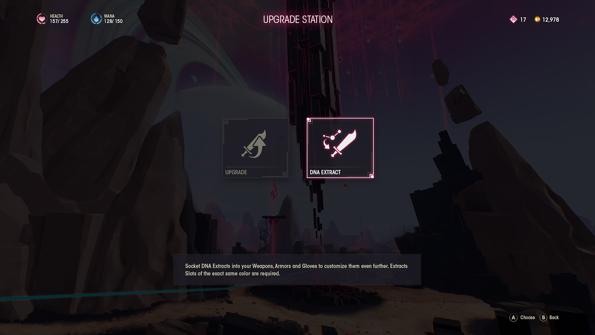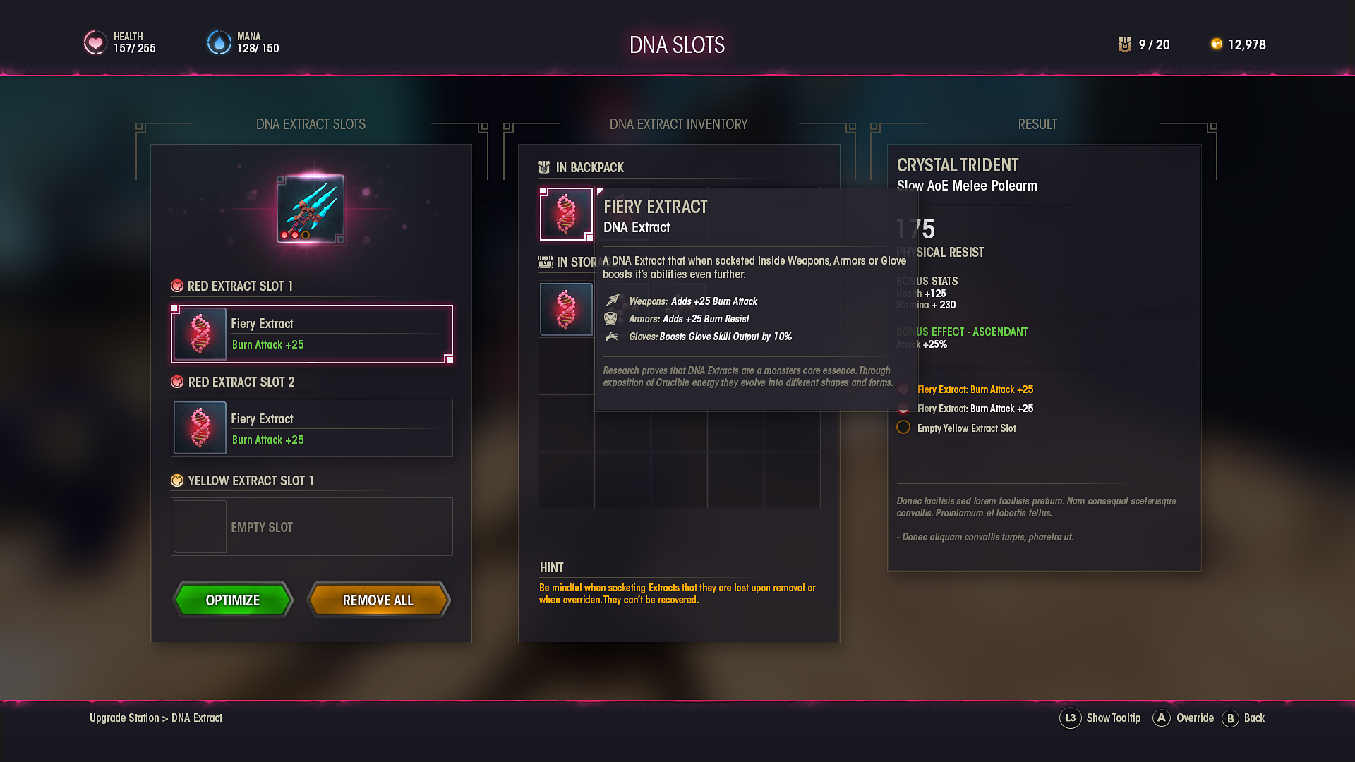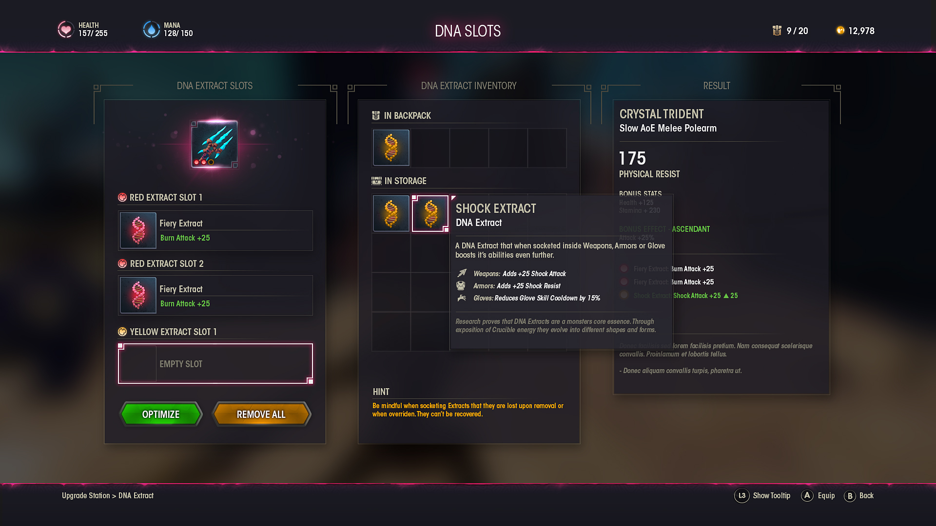 The last part of the main menus was the Data Extract menu. This was basically a socketing menu for min/maxing stats of your upgraded items. Each socket having their specific bonuses.