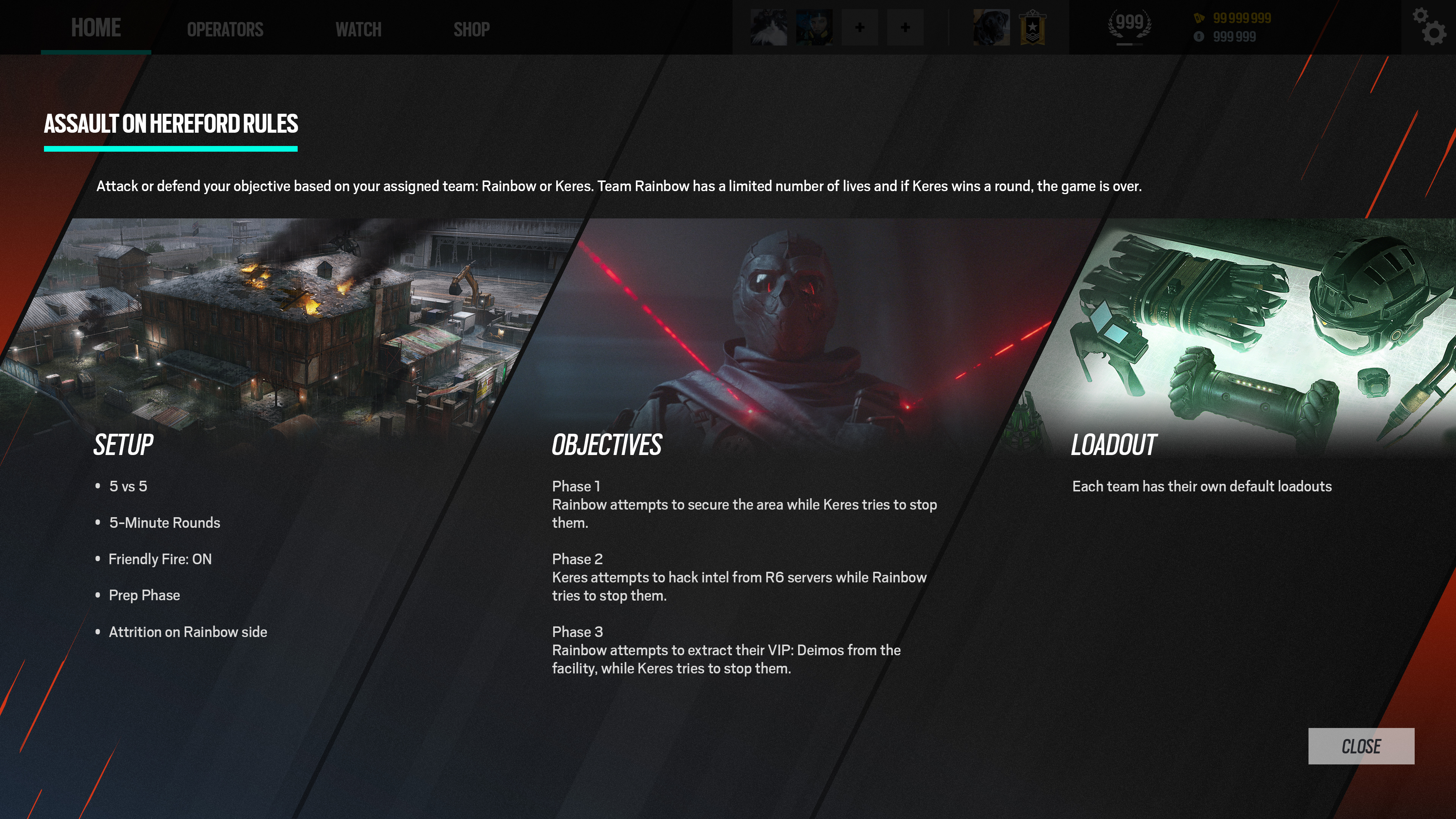The gamemode featured three step round based phases that saw the Rainbow Six team caught in an attrition mode of Secure Area, then Bomb followed by a final Hostage gauntlet. The other team, KERES Legion, had infinite respawns and their goal was to stop Rainbow at any of these phases.
