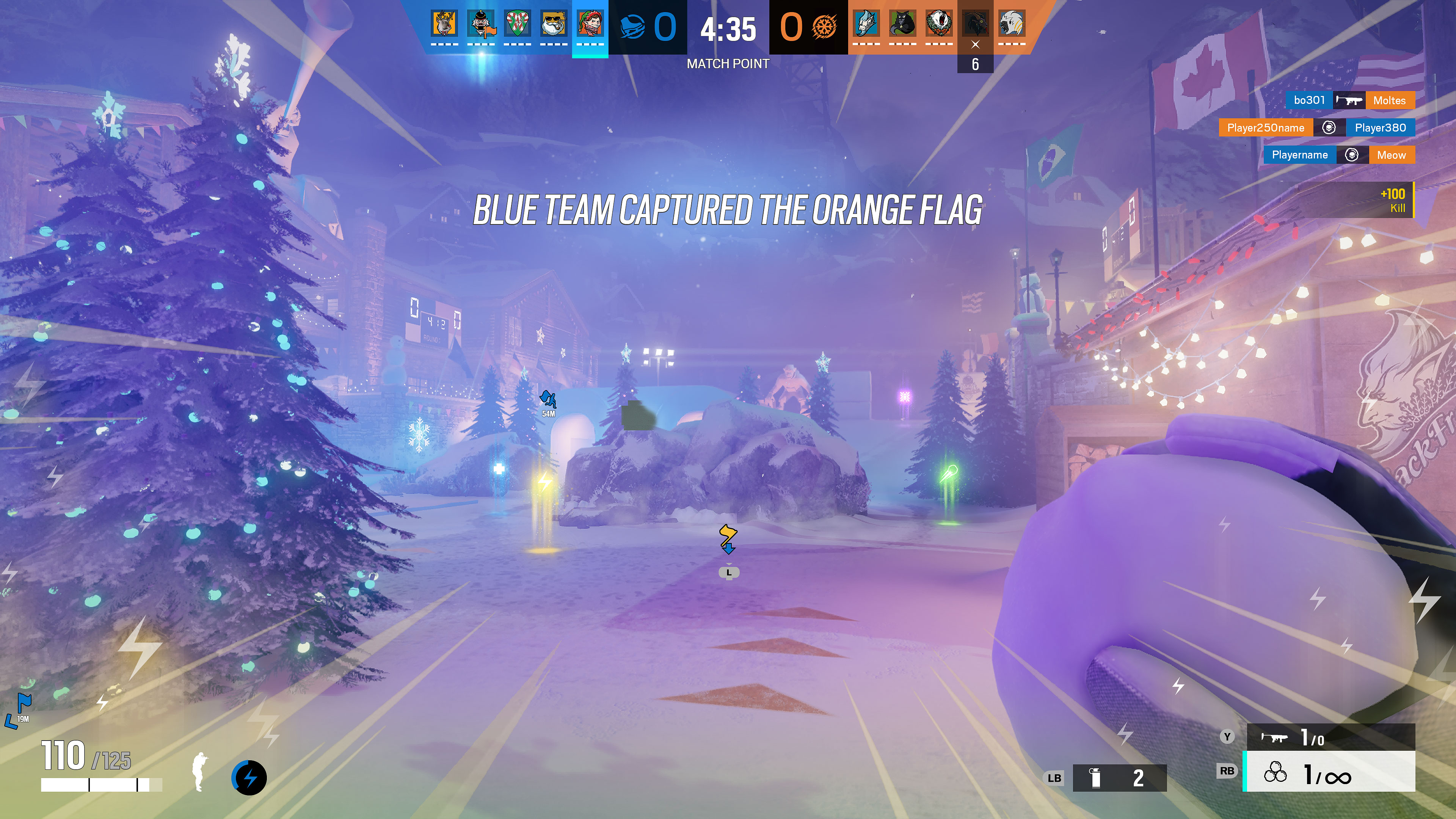 A unique snow ball throwing animation and weapon was built exclusively for this mode, alongside the Capture the Flag mode itself. Most of my focuses were on both of these and the constant clash of the "blue team" versus the "orange team" throughout.