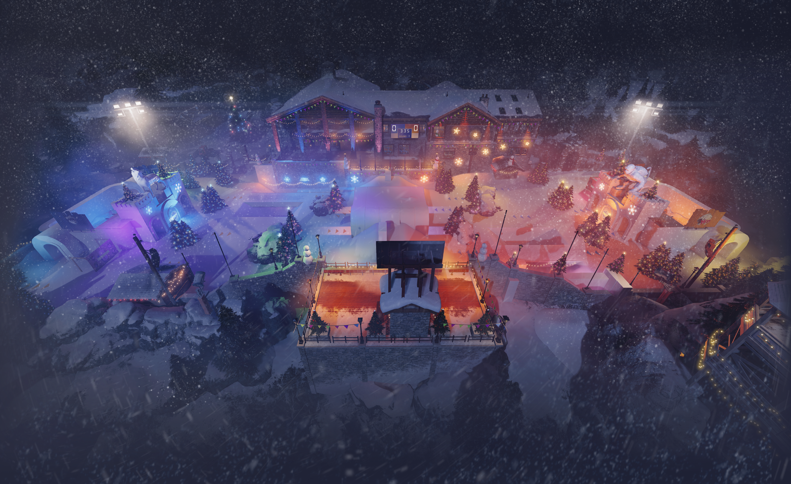 The thematic idea was to have a fun snowball sports competition along the Capture the Flag gamemode. The whole exterior of the map Chalet was completly modifed to house team-based snowforts and an outdoor arena of half-pipes, snow mounds and wodden covers.